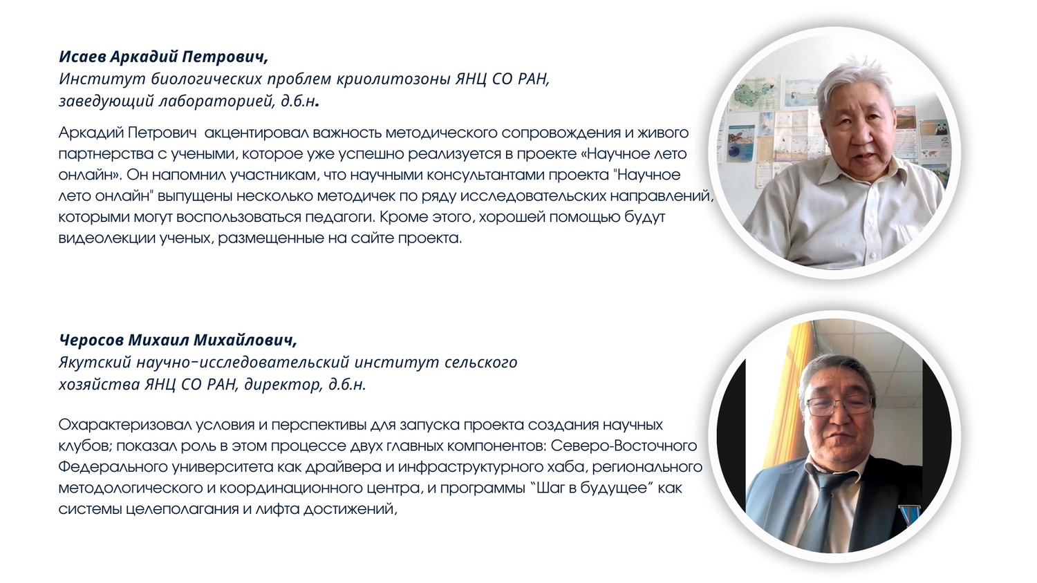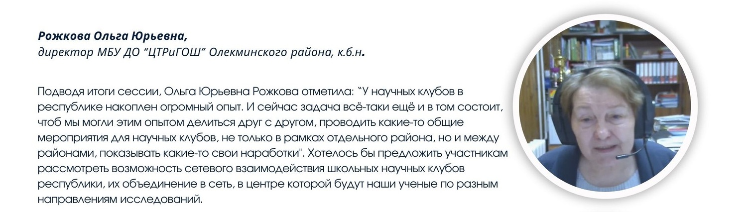6 февраля 2026 года состоялась онлайн-сессия, посвященная развитию школьных научных клубов в Олекминском районе Республики Саха (Якутия). Мероприятие было организовано МБУ ДО «Центр творческого развития и гуманитарного образования школьников» Олекминского района при поддержке Малой Академии наук РС(Я), Института биологических проблем криолитозоны ФИЦ ЯНЦ СО РАН, научно-исследовательского института сельского хозяйства ФИЦ ЯНЦ СО РАН, Академии наук РС(Я), Регионального отделения Движения Первых в РС(Я), МКУ «Управление образования Олекминского района» РС(Я). Сессия вызвала интерес и в других районах республики и на онлайн платформе КонтурТолк собрались более 90 педагогов и руководителей исследовательских объединений школьников из разных районов Якутии.